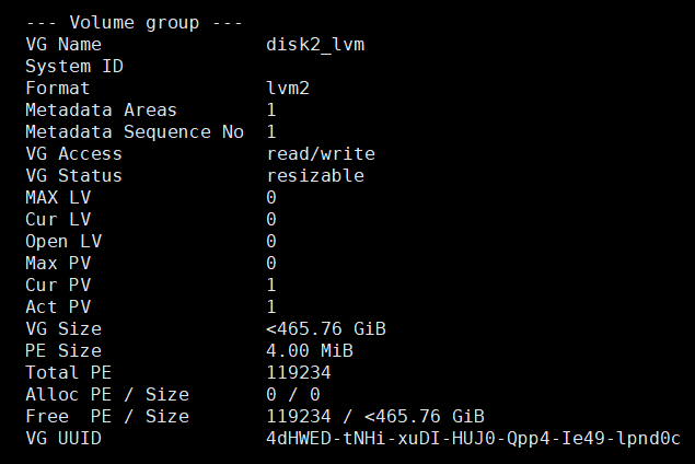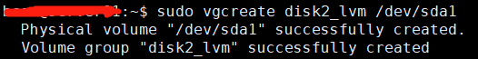 使用sudo vgcreate disk2_lvm /dev/sda1 创建一个新的vg。其中disk2_lvm是vg名字,可以自己定义,/dev/sda1是加入vg的分区,这个根据实际情况来定