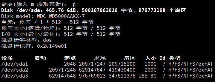 使用sudo fdisk /dev/sda 给这块硬盘分区,输入p 查看一下现有分区