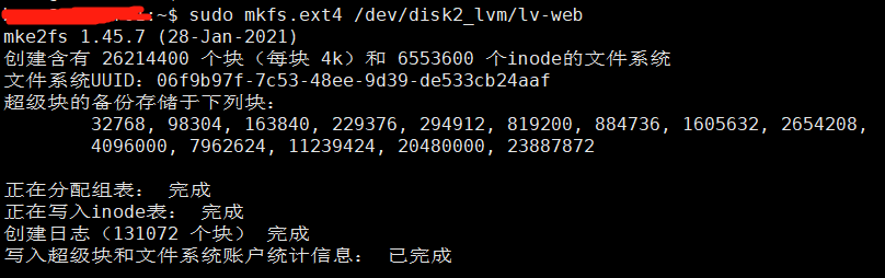 这里就格式化成ext4吧,sudo mkfs.ext4 /dev/disk2_lvm/lv-web 后面的路径是lvdisplay中查看到的LV Path。