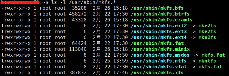 使用 ls -l /usr/sbin/mkfs.* 查看系统支持哪些文件系统格式