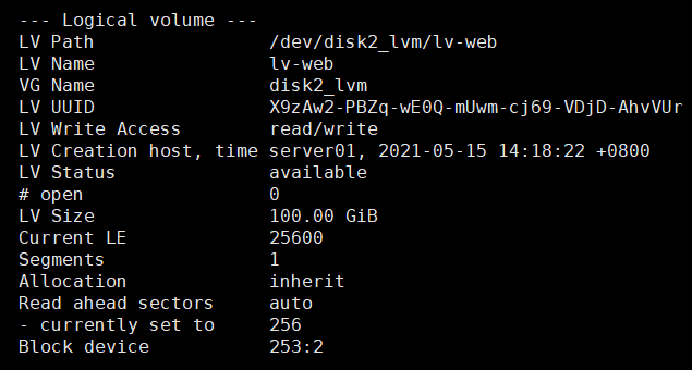 使用 sudo lvdisplay 可以查看已创建的逻辑卷