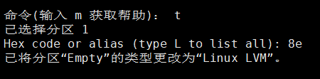输入t更改分区类型,再输入8e把分区类型设置为Linux LVM