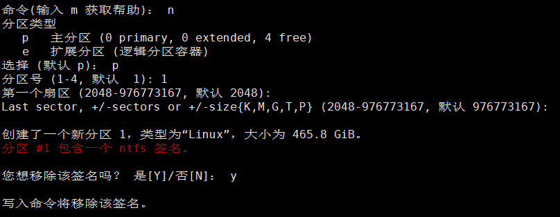 输入n 新建分区,我这里只打算分一个区,就一路回车默认就好
